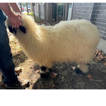 Monthey (pronounced Monty) is a full-blood wether named after a town in the Canton of Valais, Switzerland. Monthey's dam is our Iowa Kiwi and sire is Highland Isa. Monthey graded 144 at the National Iowa Show in 2025. He received a "1" in appearance because he has a black bum spot and black spot above the skirt line on his abdomen. Because of this marking fault, we chose to wether him and offer him as a pet/ram companion/pasture pal. Monthey has solid conformation and amazing wool. He is friendly and sweet natured. Monthey would make an exceptional show animal for 4H or open wool classes.